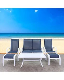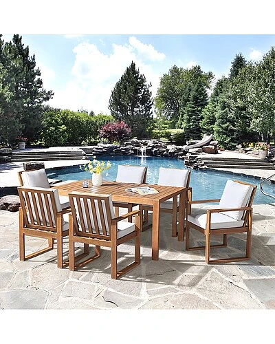 - 6 outdoor dining chairs with cushions; one dining table