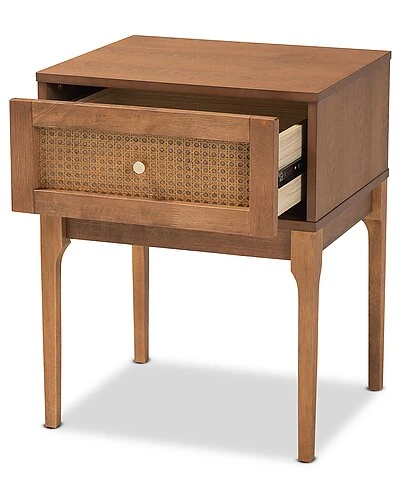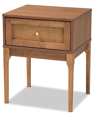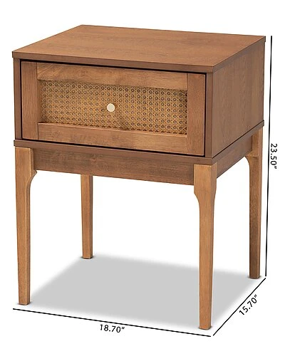 - Capture the essence of mid-century beauty at your bedside with the retro inspired Ramiel nightstand. Made in Malaysia, this charming piece consists of a solid wood frame adorned with woven rattan embellishments. The drawer offers convenient storage for all your nighttime essentials while reserving the tabletop for daily use. The Ramiel requires assembly and features a petite metal drawer knob that brilliantly stands out against the natural tones of the wood. Carrying on the allure of retro design, the Ramiel nightstand is sure to become a beloved addition to any bedroom layout. Overall Dimensions: 18.70″ W x 15.70″ D x 23.50″ H; Drawer Dimensions: 15.40″ W x 13.60″ D x 4.30″ H; Legs: 12.80″ H;