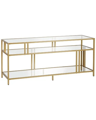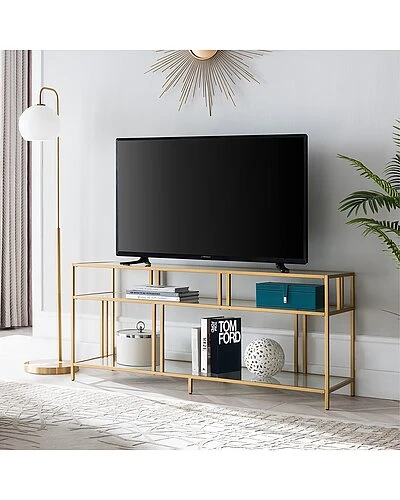 - A strong linear profile sets this industrial-inspired TV stand apart. It’s double-barred accents offset the 3 tiers of durable glass shelving, creating an artful backdrop for your media collection or decorative items.