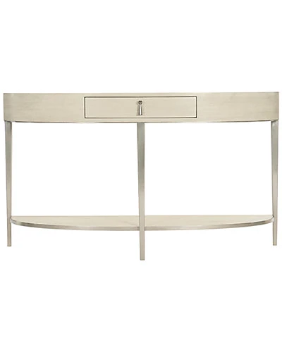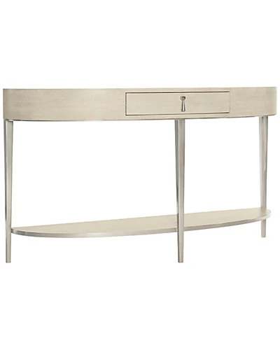 - The East Hampton Collection is defined by its minimalist aesthetic, achieved through soft finishes, graceful curves and subtle accents. Perfect for an entryway or foyer, this console table provides a warm, stylish welcome. With a gorgeous demilune profile and minimalist, refined proportions, this single-drawer table in cerused ash features a tubular stainless steel based with an inset wood shelf to show off your favorite objects.