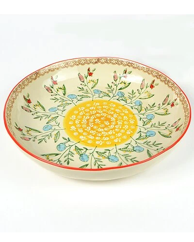 - The Ella Ramen and Dinner Bowl Set is both beautiful and perfectly practical. The lovely floral designs of the Ella collection are reminiscent of the traditional block printed Sanganer patterns of Indian textiles. Each bowl shape has a unique design and is hand painted and finished by trained artisans. The taller ramen bowl is great for noodle and rice dishes, or even for cereal and comes with a pair of re-usable wooden chopsticks and is designed with a chopstick rest at the top. The large bowl is ideal for dinner sized meals, soups and stews or also for serving. The Ella Bowl collection consists of a 2 piece Ramen Bowl set available with a red or aqua rim with coordinating floral motifs and a 3 piece storage bowl set. Service for 2 includes: 2 Dinner Bowls (9.9 x 9.9 x 1.85, 28oz Capacity)