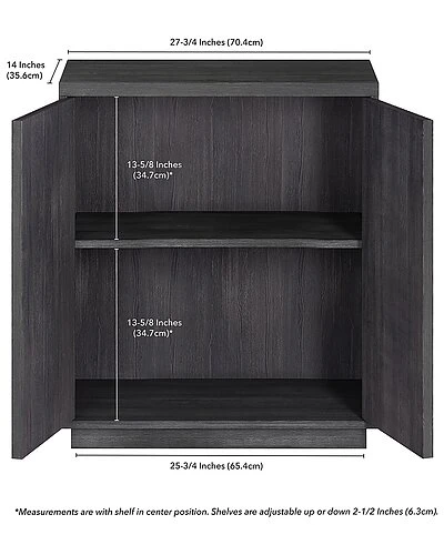 - Keep your home office, family room, or bedroom organized without sacrificing style. This sturdy and compact accent cabinet is designed to give you a flexible storage option wherever you need it, whether itÕs for office supplies, closet overflow, or just the various knick-knacks and doo-dads that donÕt have a space of their own. Featuring an adjustable center shelf and cable management cut-outs, this versatile cabinet can even help you organize printers, game consoles, or charging stations. The wood-grained finish adds warmth and casual appeal while the hidden storage behind the two doors allows you to hide away all the odds and ends that create visual clutter around your home.